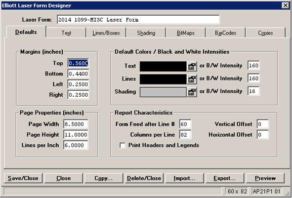 Go to Elliott 7.5 or 8.0 and choose Accounts Payable -> Processing -> Print 1099 Forms -> Print -> Print 1099 Forms. For best results, you should use a laser form template to modify the top and bottom margins. You can either modify the existing laser form or create a new laser form with the following margins: